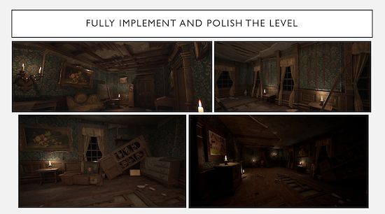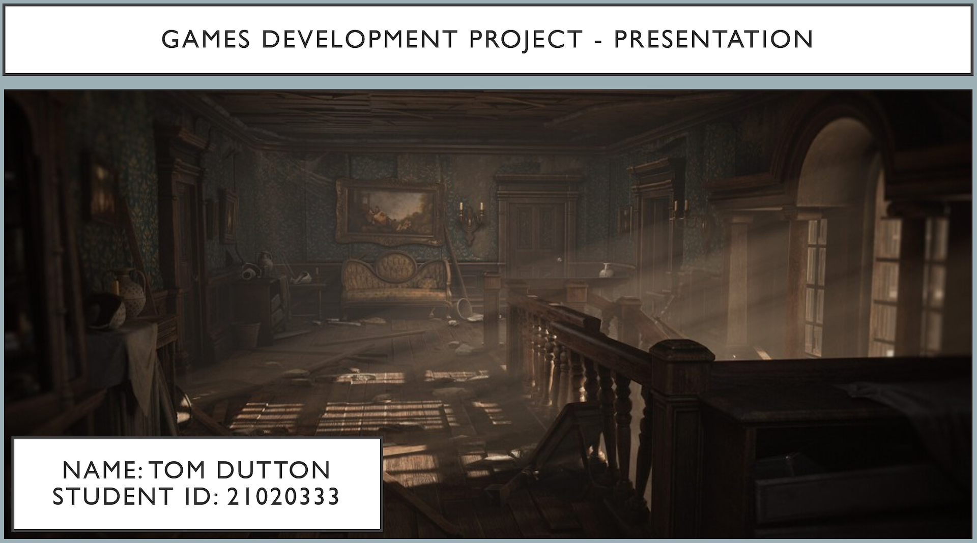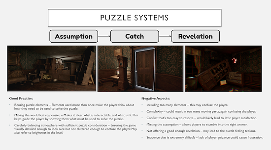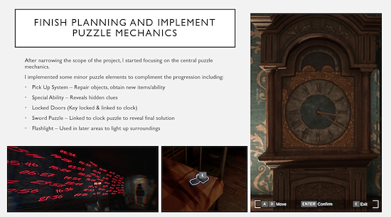 Another large element of this project meant that I had to pitch multiple presentations to my supervisors to discuss my design theory and the overall development process. I had to validate changes based on playtesting feedback and discuss potential improvements to ensure the project was always being driven in the right direction. Here are some extracts from my presentations.